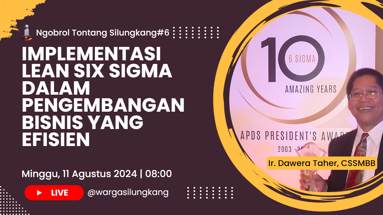 Podcast episode ke-6 Ngobrol Tontang Silungkang akan membicarakan tentang “Implementasi Lean Six Sigma dalam Pengembangan Bisnis yang Efisien.” bersama narasumber kita, Bp. Ir. Dawera Taher, CSSMBB. Pada episode ini dimulai dengan sejarah dan prinsip-prinsip metode Sigma, penerapannya di berbagai industri, dan dampaknya terhadap pendidikan dan tenaga kerja. Terakhir, mereka menekankan pentingnya analisis data dalam pengambilan keputusan, potensi bisnis online, dan kebutuhan untuk perbaikan dan inovasi berkelanjutan dalam bisnis.